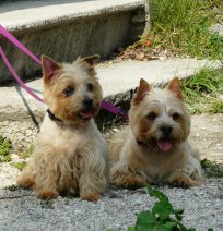 Now retired, we have more time for our interests - music (Jon sings and Mary plays the 'cello - we met on a recorder-playing summer school, Jon has begun to play the recorder seriously again), wine (Jon's especial enthusiasm), knitting (Mary's), books and reading, languages and meeting and talking to people. We live in Lunel with Evie, a Norwich terrier (pictured below with Trudy who died in 2012), with Pierre & Charles (tortoises).